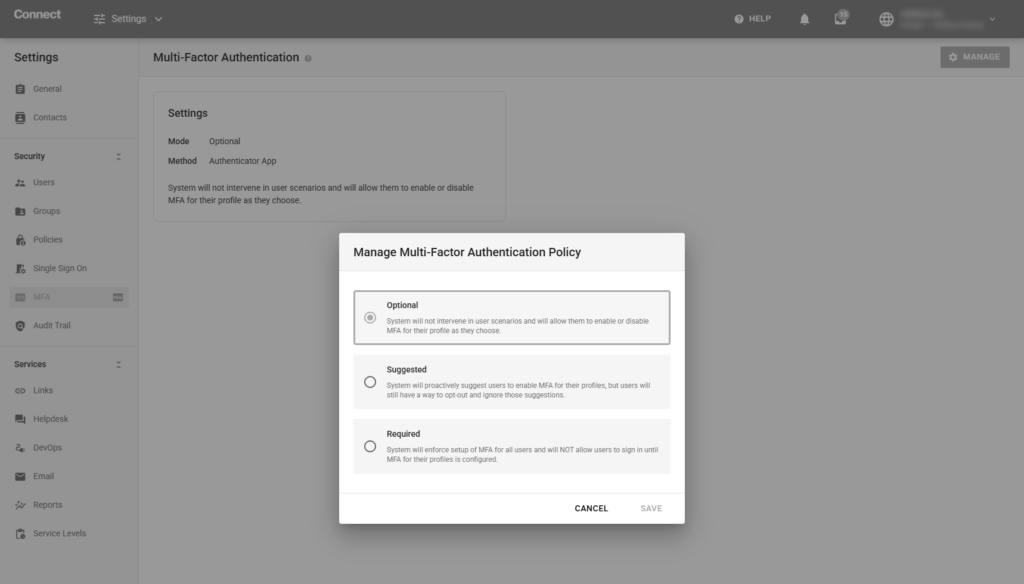 If the account is set up with a Single Sign On integration with the partner’s own Active Directory, the Active Directory’s settings and procedures will take precedence and override any Connect platform MFA settings.